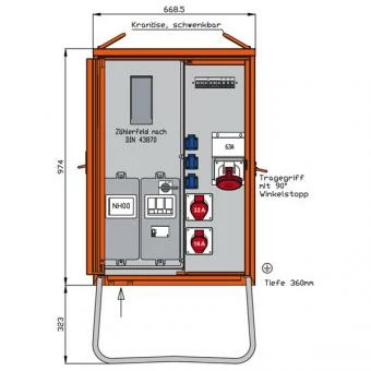 Anschlussverteilerschrank 44kVA mit Zählerplatz, RCD Typ B, 5 LS, 3 CEE-Abgänge 16-63A und 3 Schukos